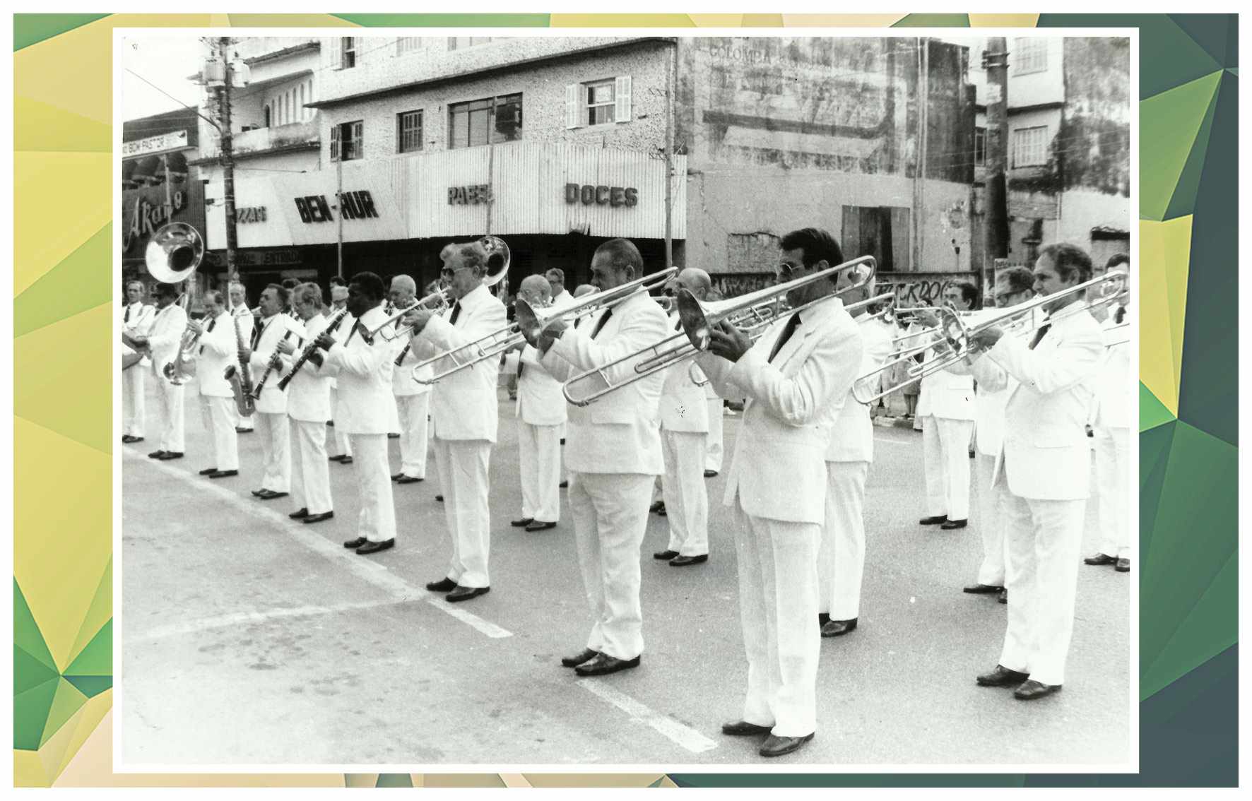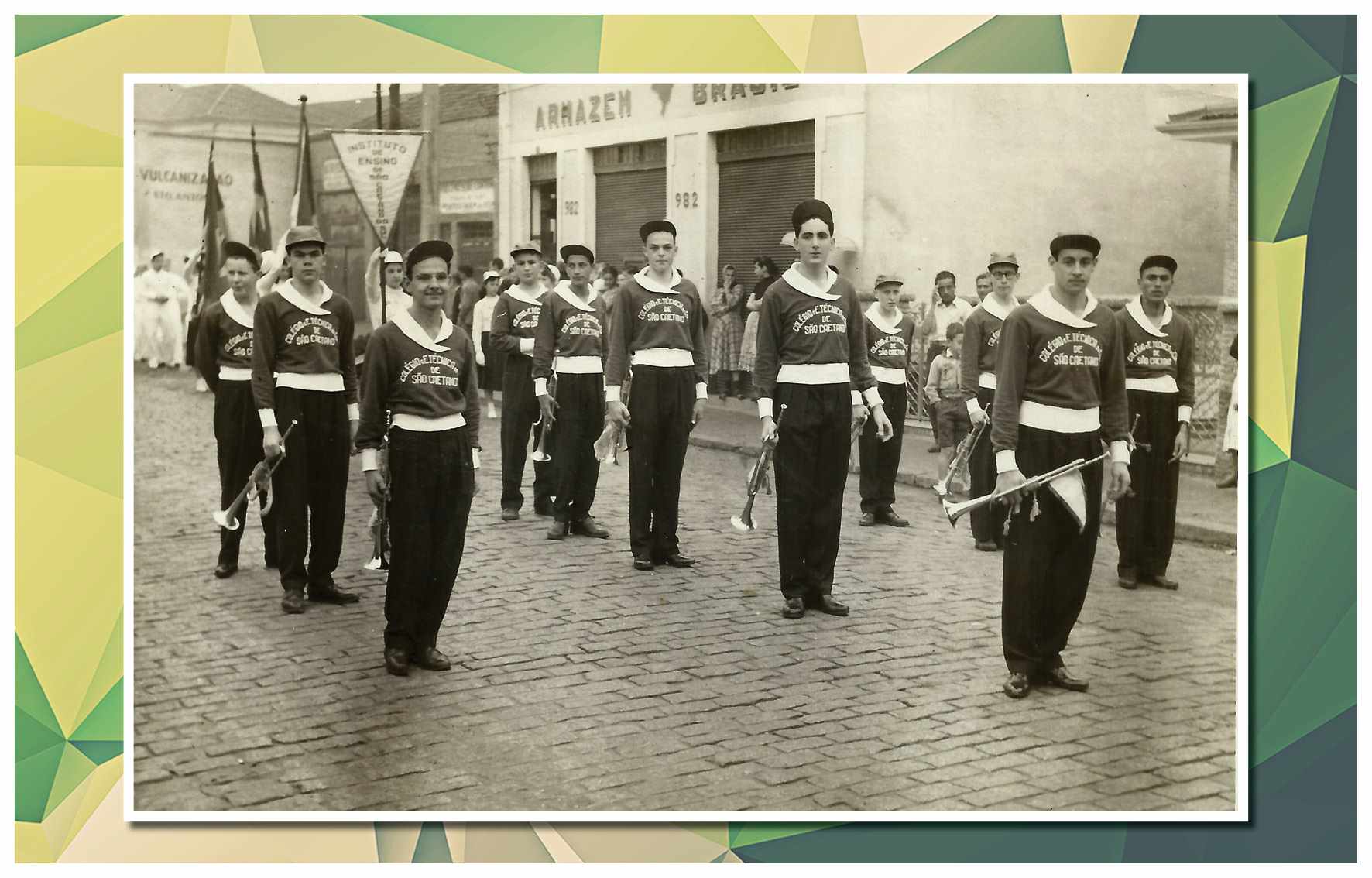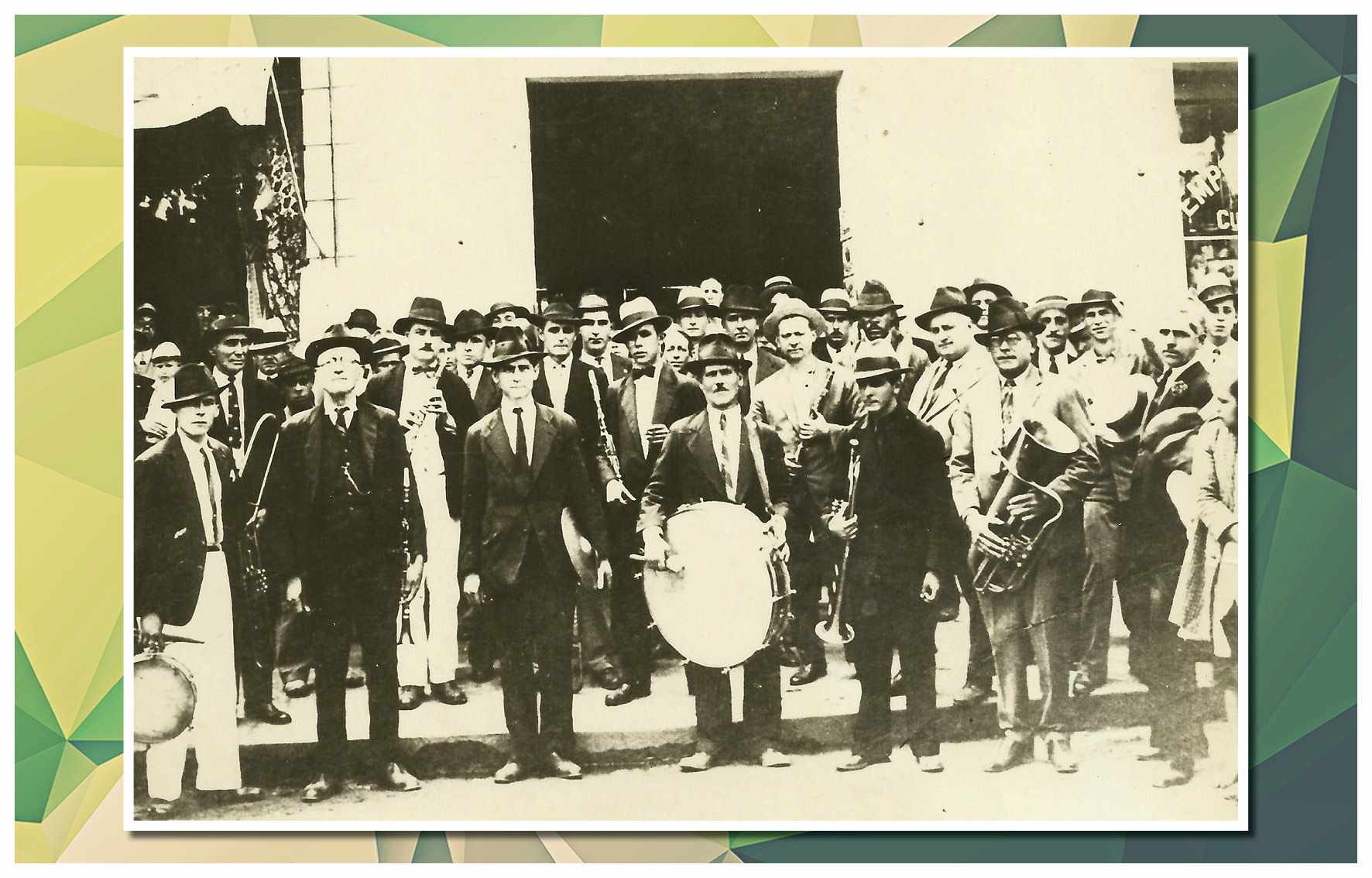Corporação musical Lyra São Caetano, sob a batuta do maestro Luiz Modena. Vemos os integrantes da banda defronte ao Empório Cuccato, na esquina da Rua João Pessoa e da Avenida Conde Francisco Matarazzo. Foram identificados: Luiz Modena, João Domingos Bombassei, Stoquio Milani, Luiz Bálsamo, Delmestre, Luvigino Neri, Kelo Garbelotto, Sicala, David Cuccato e Américo Terezina. Foto do início da década de 1930