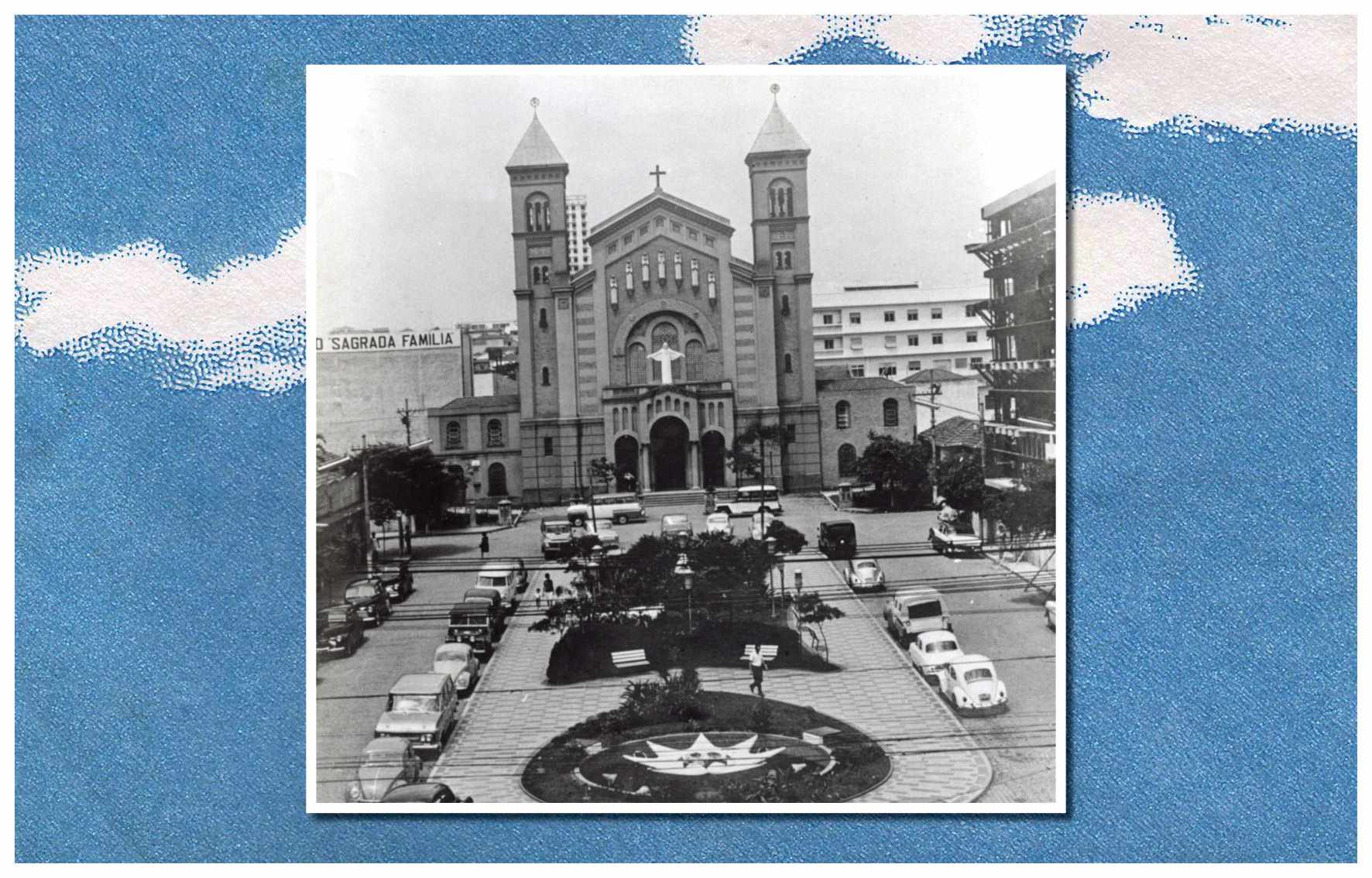 Praça Cardeal Arcoverde na década de 1960. Ao fundo, a Igreja Matriz Sagrada Família | Acervo/Fundação Pró-Memória de São Caetano do Sul | Saiba mais sobre o Bairro Centro em www.fpm.org.br/HistoriaBairros/List