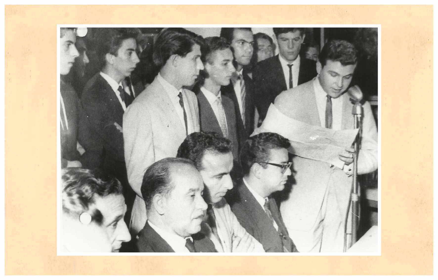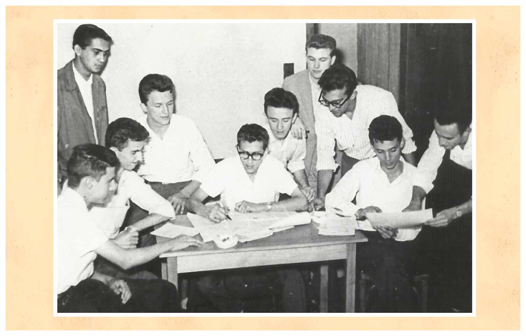 Estudantes participantes do Grêmio Estudantil 28 de Julho, da Escola Estadual Cel. Bonifácio de Carvalho, em 1958. Na foto foram identificados: Norival José Oliva, Laercio Mombelli, Enio Campoi, Salvador Kalmar, Fuad Sayar, Sídney Cavassani, Edilson Salgelli, Paulo Gonçalves, Ramis Sayar e Daniel Fiorotti