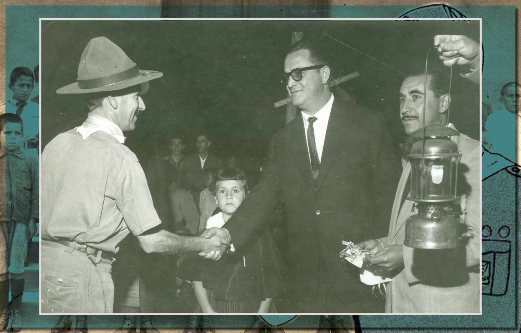 Homenagem ao Grupo Escoteiro João Ramalho, realizada em 1958. Vemos o chefe José Gonçalves de Oliveira sendo cumprimentado pelos vereadores Hermógenes Walter Braido e João Anhê - Acervo/Fundação Pró-Memória de São Caetano do Sul