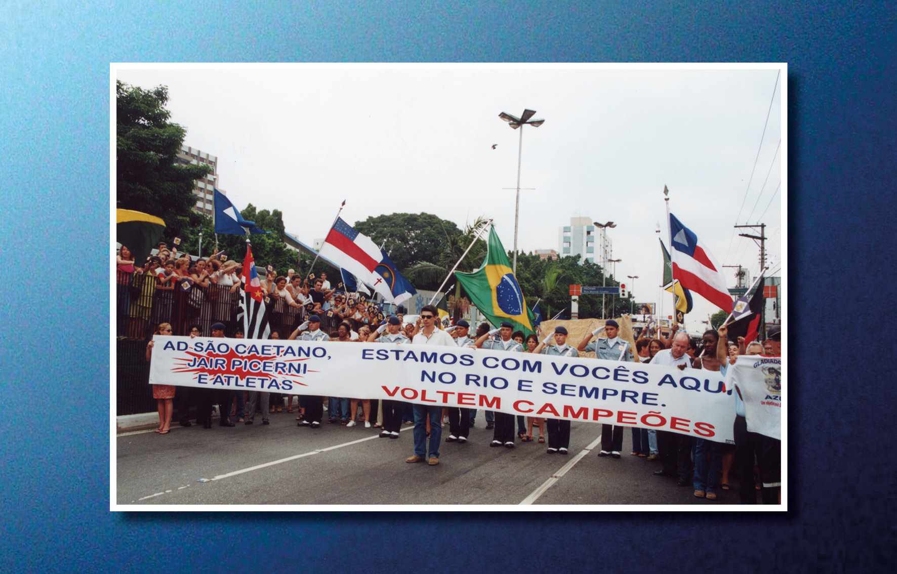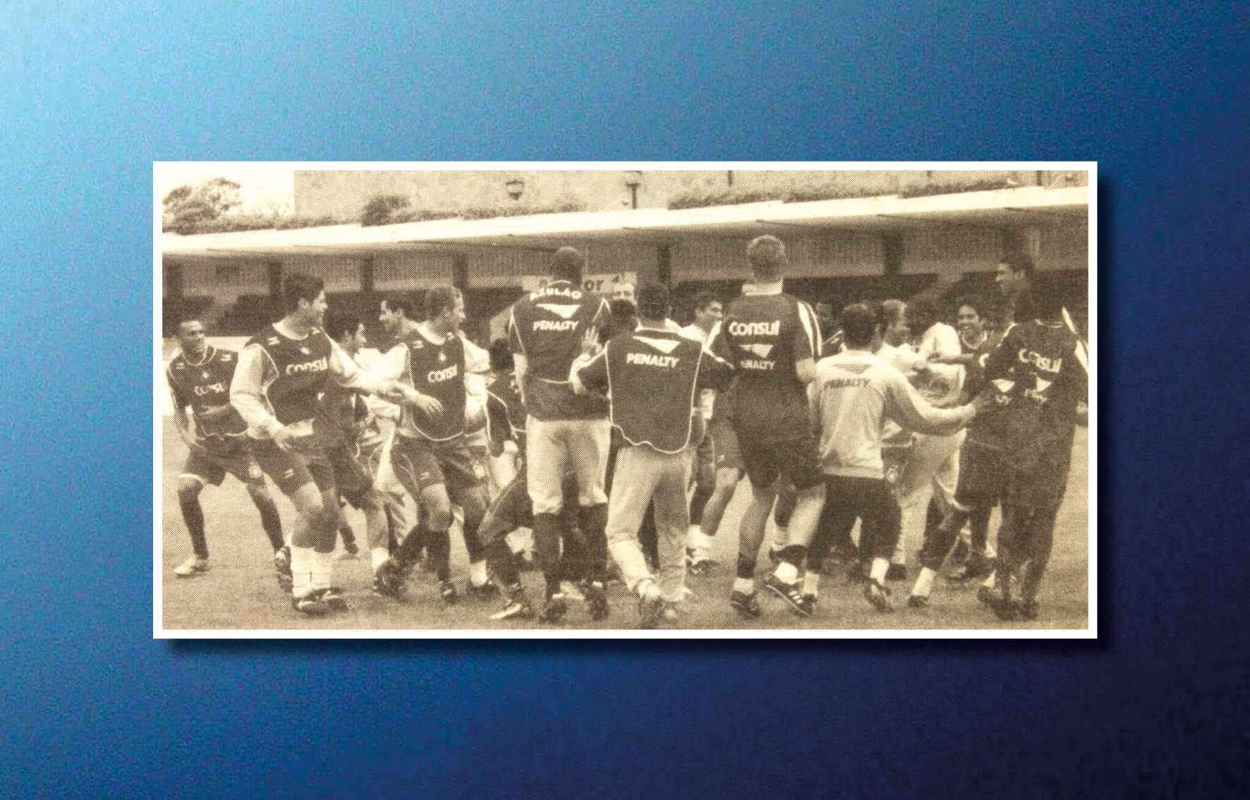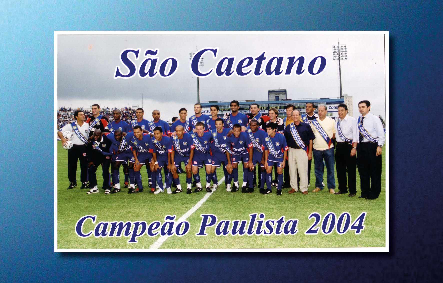 Jogadores da AD São Caetano festejando o título ganho no Campeonato Paulista (Paulistão), em 2004, quando derrotou o Paulista no primeiro e segundo jogos. O técnico era Muricy Ramalho e os jogadores das finais foram: Silvio Luiz, Tiago, Dininho, Serginho, Triguinho, Marcelo Mattos, Mineiro, Gilberto, Marcinho, Fabrício Carvalho e Euller Reprodução/ Jornal Sangue Azul (Acervo/FPMSCS)