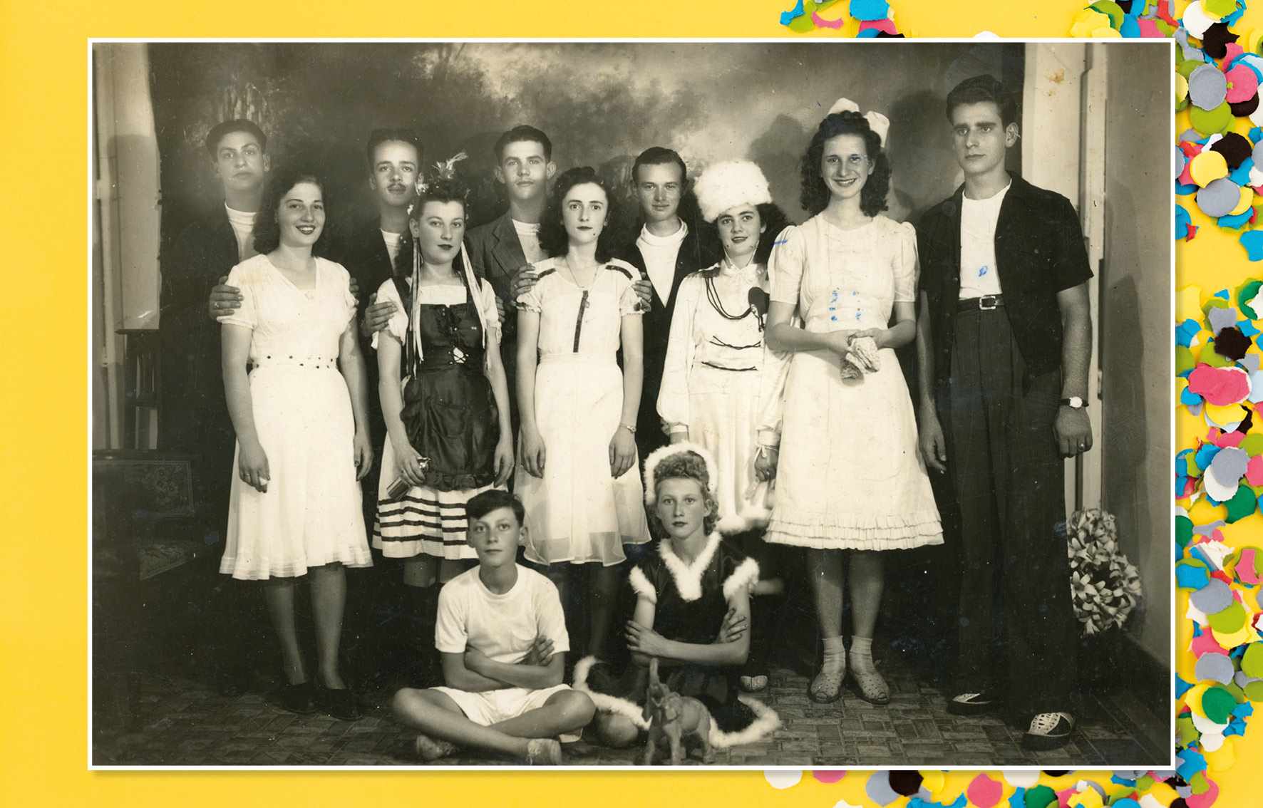 Antes do baile de carnaval, uma foto de amigos fantasiados, em 1941. Foram identificados: Rosa Rapuano, Mauro Corvello, Olga Infanti, Carlos, Loly Lonso, Izolda Lonso, Orlanda e Accácio. Sentados, vemos: Otávio e Ivone Infanti Acervo/FPMSCS