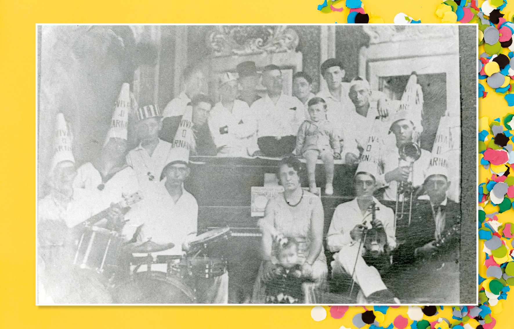 Grupo musical de carnaval que tocava nos bailes do Clube Ideal, em 1943. Da esquerda para a direita, vemos: Venâncio, Aldo Negrini, Nicola Perrella, Matheus Constantino, Otávio Tegão, Bisquolo, Pino Negrini e a pianista Elisa Acervo/FPMSCS