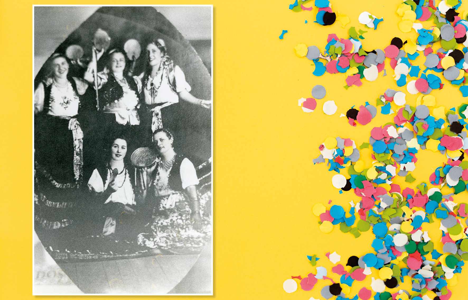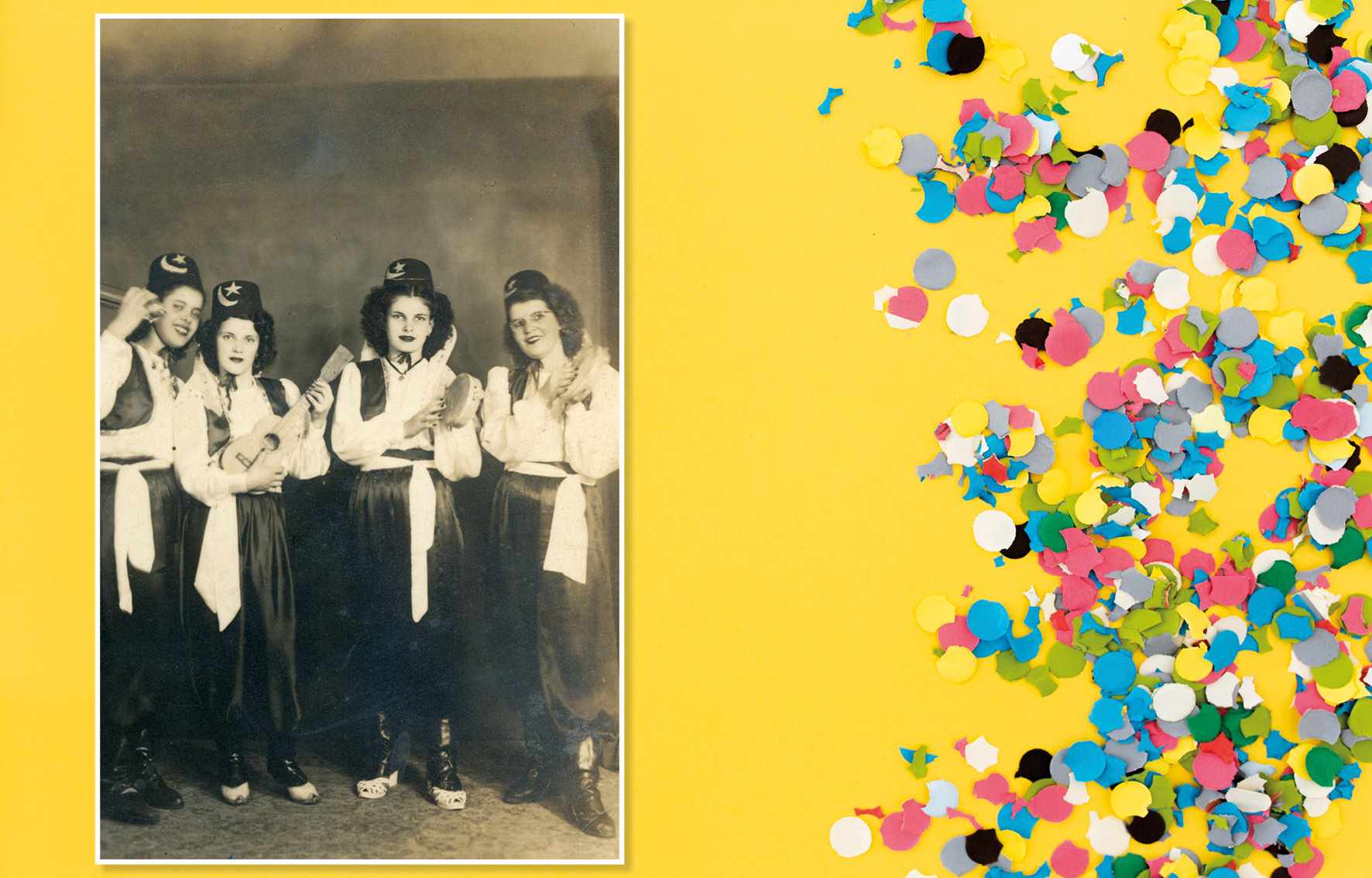 Carnaval no Clube Ideal, em 1945. Sentadas, vemos: Yolanda Zaparolli Laranjeira e Luísa Tegão. Em pé, estão: Teresa Grecco, Pina Tegão e Dorinda Locoselli Acervo/FPMSCS