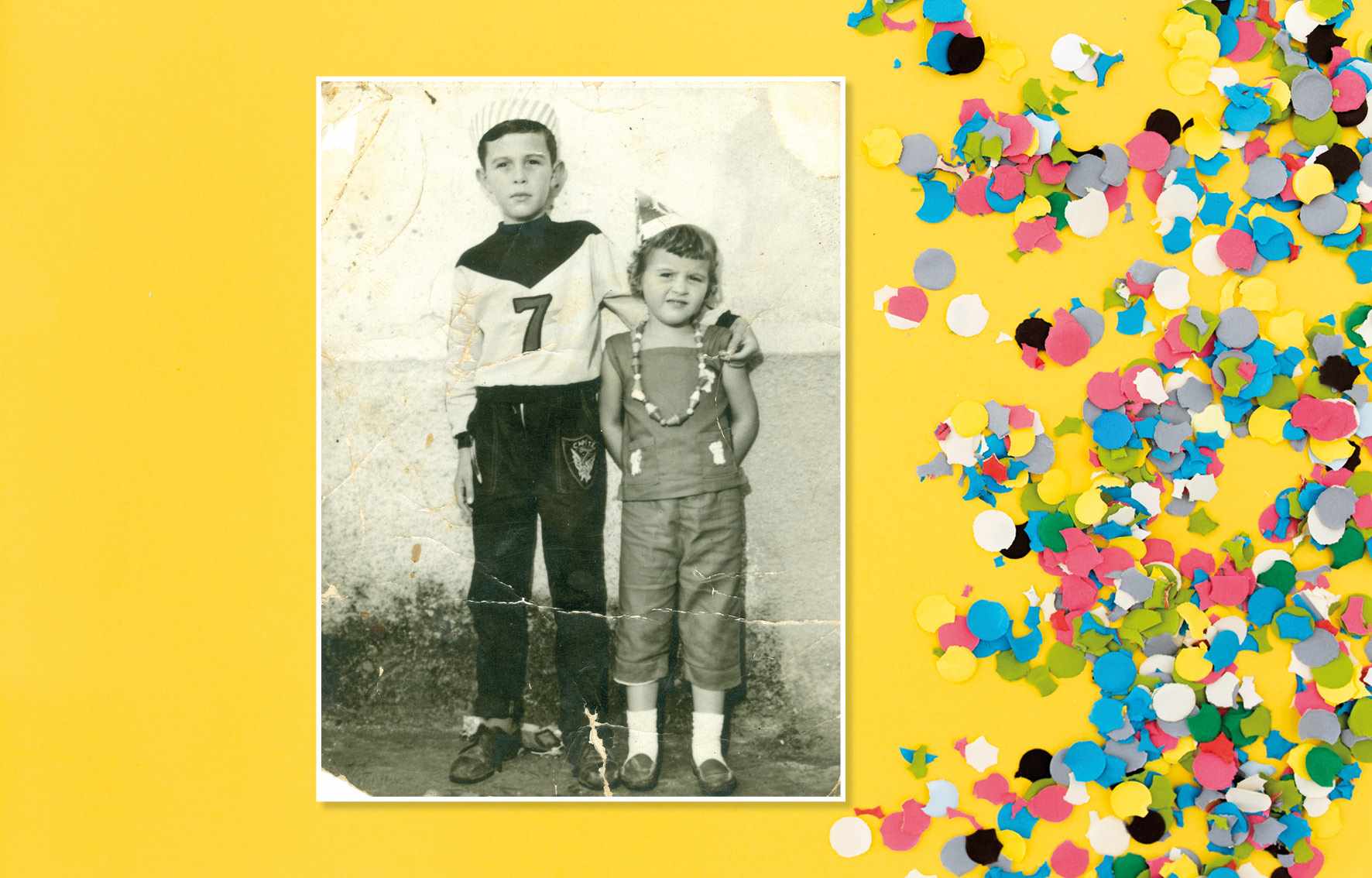 As crianças Ademir João Perrella e Ângela Maria, fantasiados de Capitão Sete e sua companheira, no carnaval do São Caetano Esporte Clube, em 1961 Acervo/FPMSCS