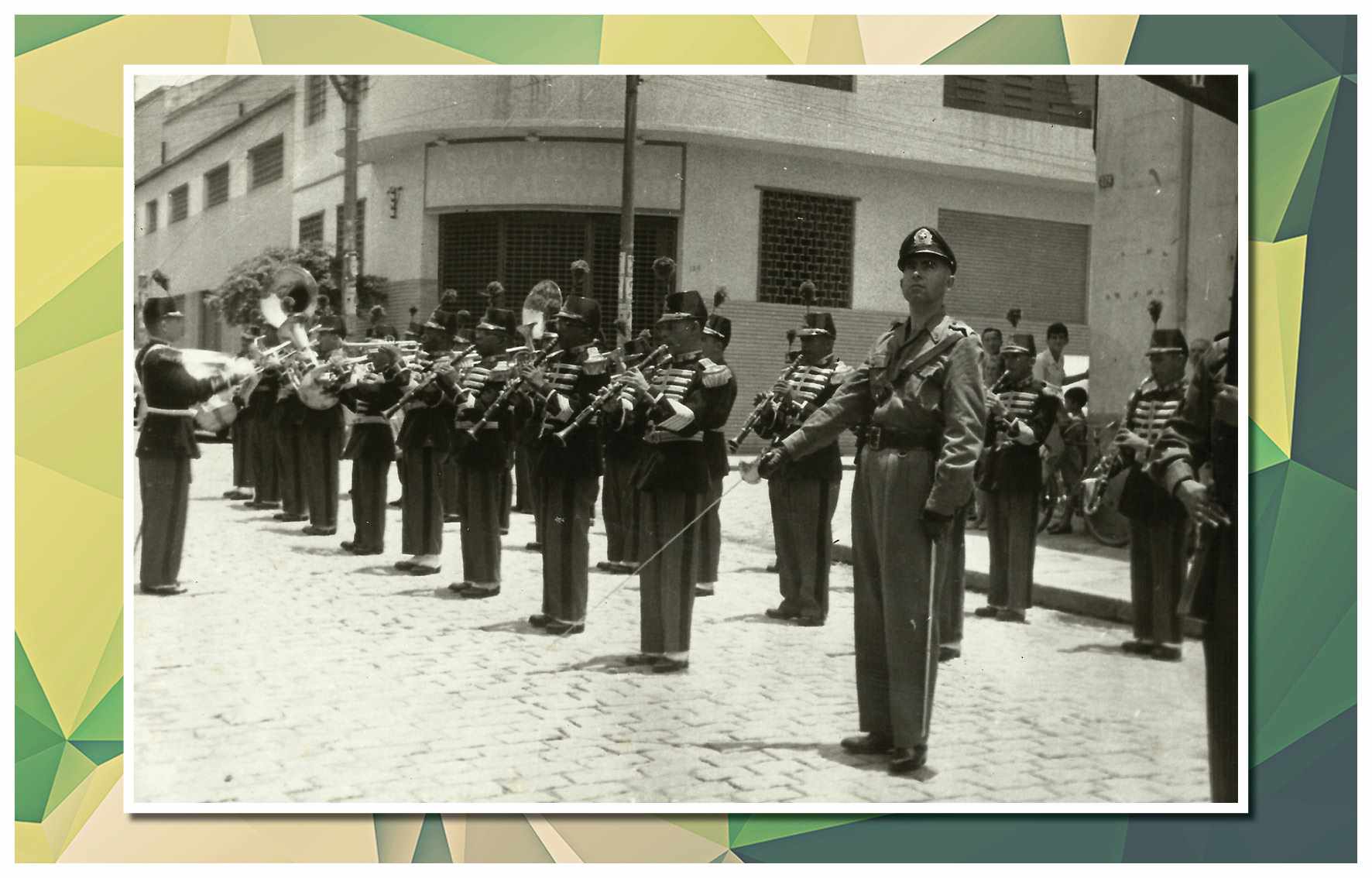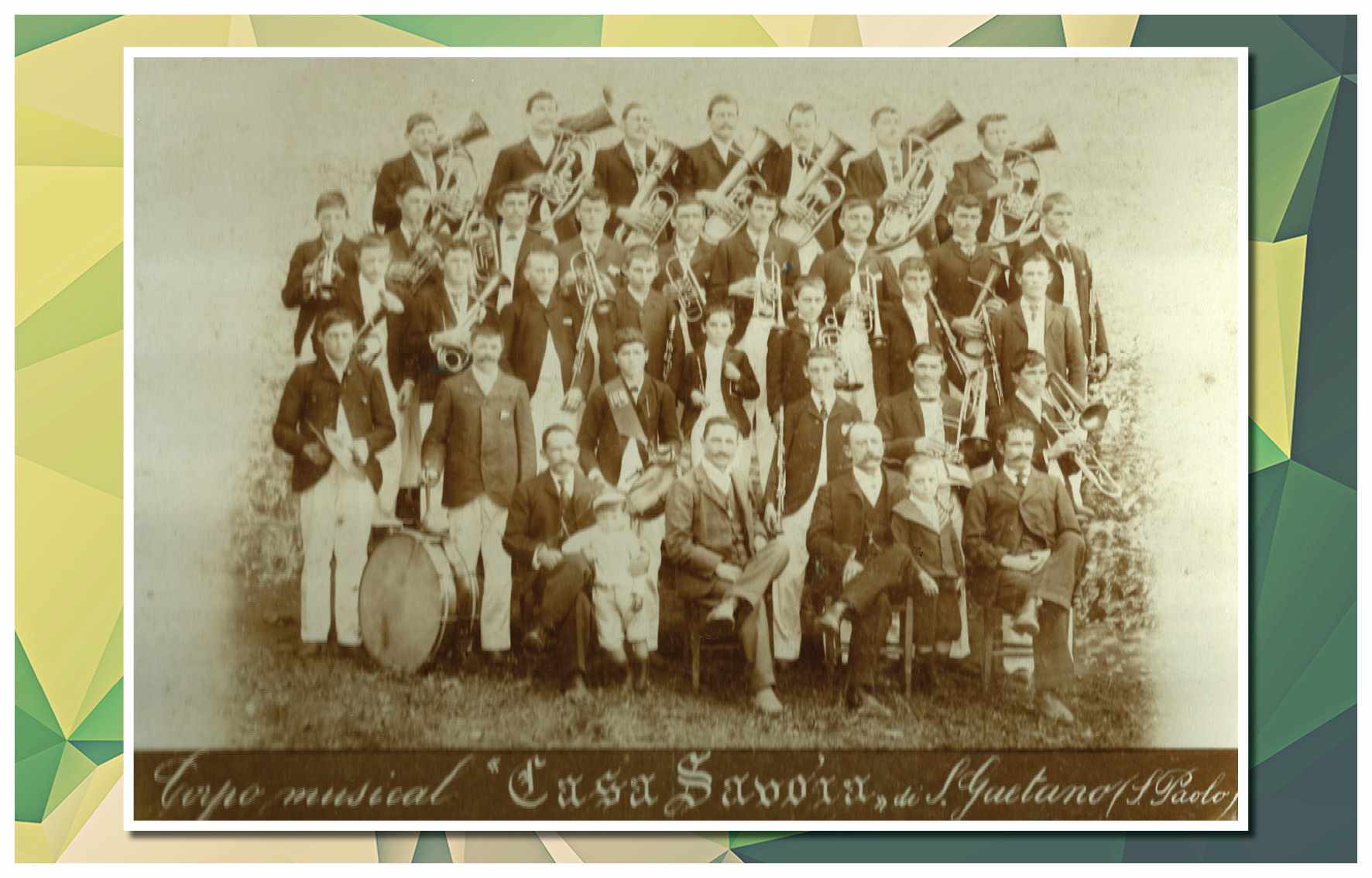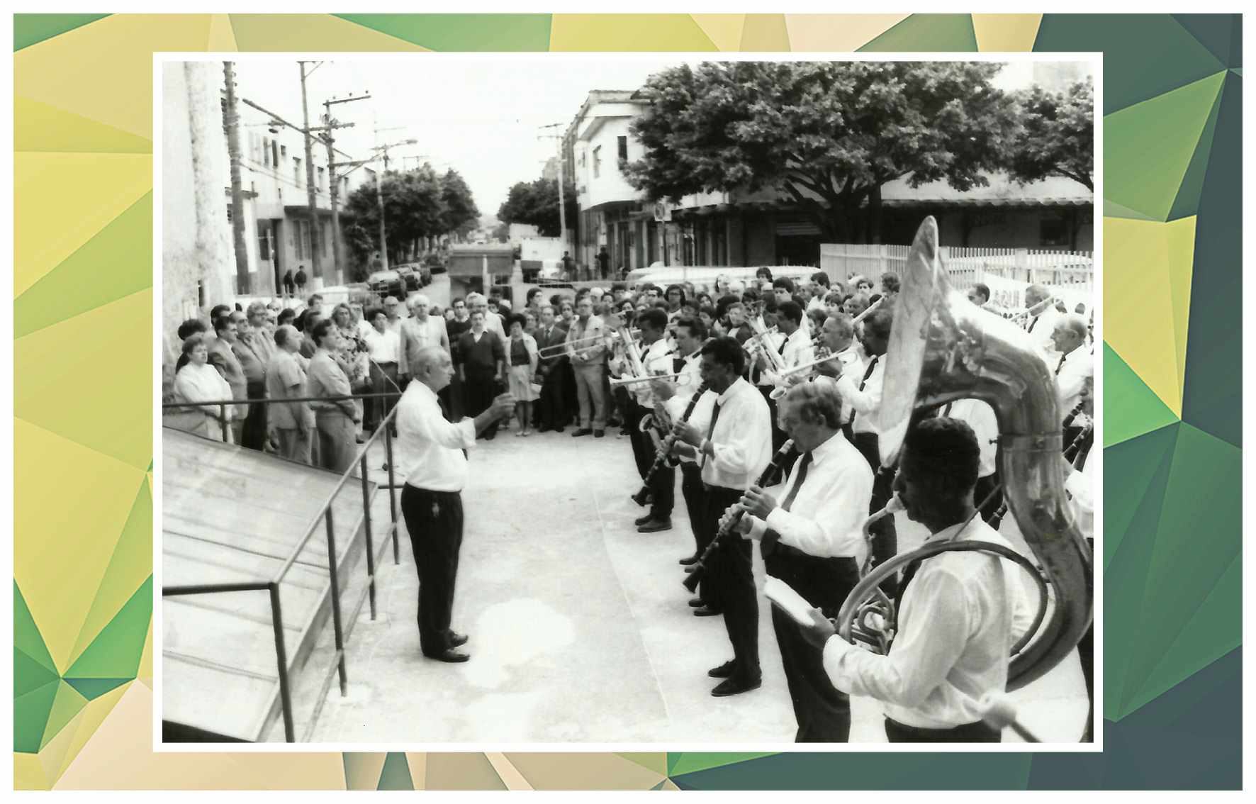 Corporação musical Lyra São Caetano, sob a batuta do maestro Luiz Modena. Vemos os integrantes da banda defronte ao Empório Cuccato, na esquina da Rua João Pessoa e da Avenida Conde Francisco Matarazzo. Foram identificados: Luiz Modena, João Domingos Bombassei, Stoquio Milani, Luiz Bálsamo, Delmestre, Luvigino Neri, Kelo Garbelotto, Sicala, David Cuccato e Américo Terezina. Foto do início da década de 1930