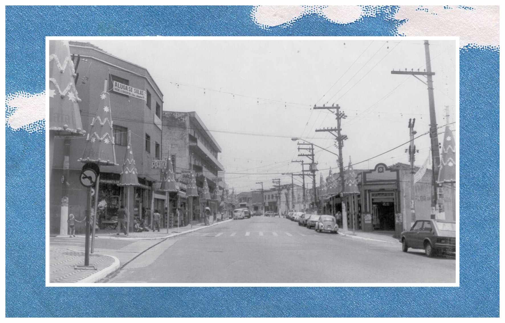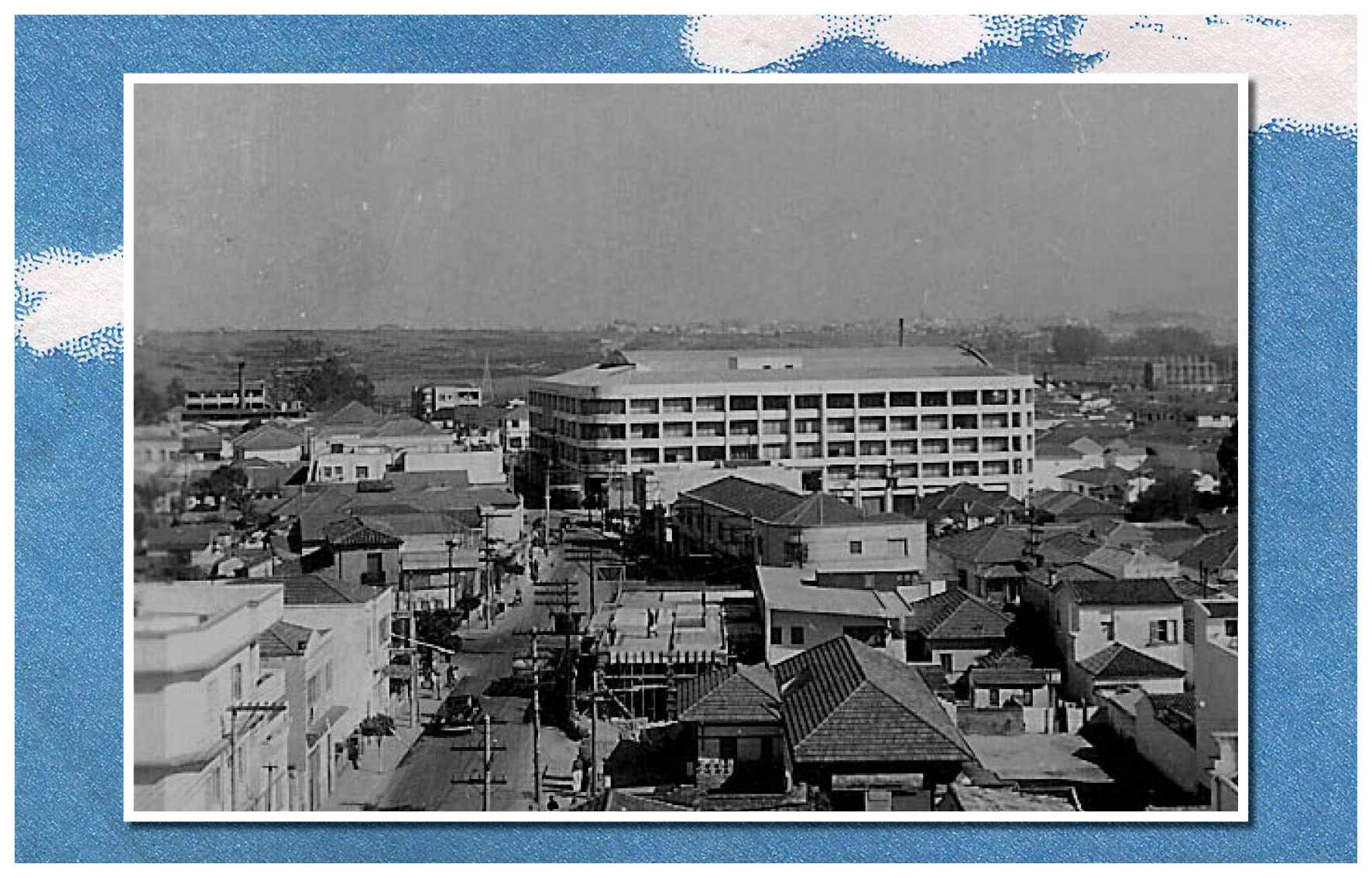 Vista panorâmica da Rua Baraldi, em foto de 1959. Ao fundo, o Edifício Vitória | Acervo/Fundação Pró-Memória de São Caetano do Sul | Saiba mais sobre o Bairro Centro em www.fpm.org.br/HistoriaBairros/List