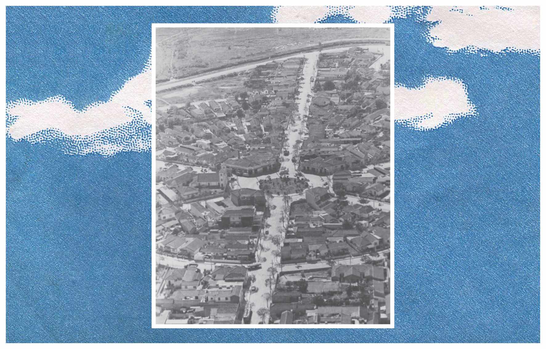 Vista aérea na qual é possível observar algumas referências do Bairro Olímpico | Acervo/Fundação Pró-Memória de São Caetano do Sul | Saiba mais sobre o Bairro Olímpico em www.fpm.org.br/HistoriaBairros/List