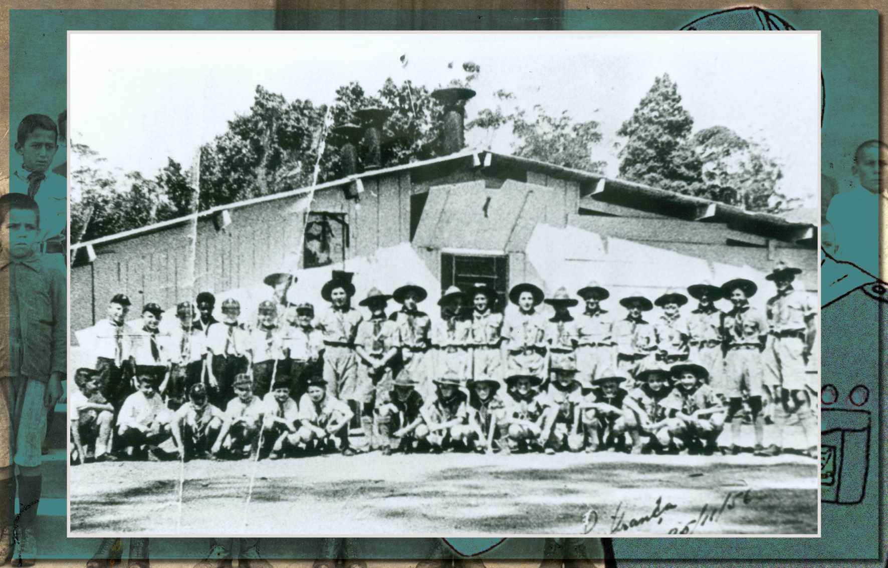 Antiga sede do Grupo Escoteiro João Ramalho, nas dependências da General Motors do Brasil. O primeiro dos adultos, da esquerda para a direita, é o chefe do grupo, José Gonçalves de Oliveira. Foto de 25 de novembro de 1956 - Acervo/Fundação Pró-Memória de São Caetano do Sul
