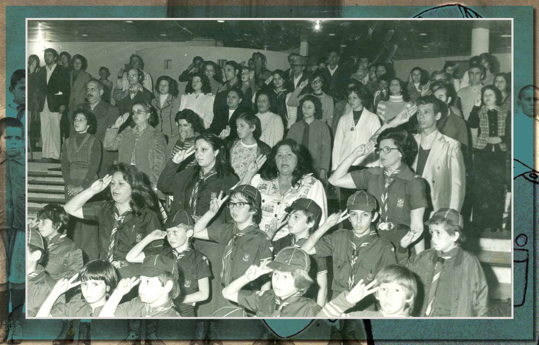 Público durante comemoração do 35º aniversário de fundação do Grupo Escoteiro São Francisco de Assis, em 1985, realizada na antiga sede do grupo, que ficava Avenida Goiás, nº 600 - Acervo/Fundação Pró-Memória de São Caetano do Sul
