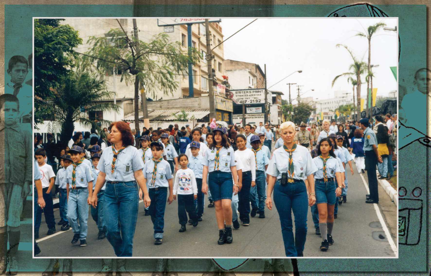 Caminhada cívica realizada na Avenida Presidente Kennedy, em 1998. Vemos, na foto, a Alcateia de Lobos do 9º Grupo de Escoteiros São Francisco de Assis, acompanhando as chefes Dirce Guerra e Gina P. Bassi - Acervo/Fundação Pró-Memória de São Caetano do Sul