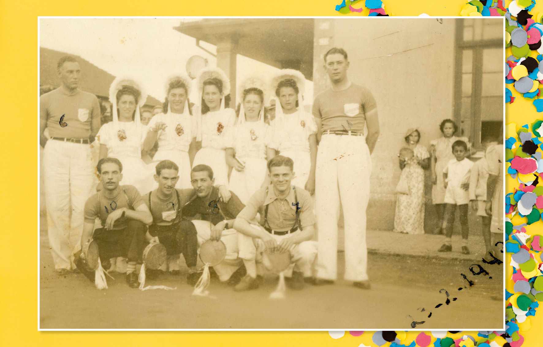 Grupo musical de carnaval que tocava nos bailes do Clube Ideal, em 1943. Da esquerda para a direita, vemos: Venâncio, Aldo Negrini, Nicola Perrella, Matheus Constantino, Otávio Tegão, Bisquolo, Pino Negrini e a pianista Elisa Acervo/FPMSCS