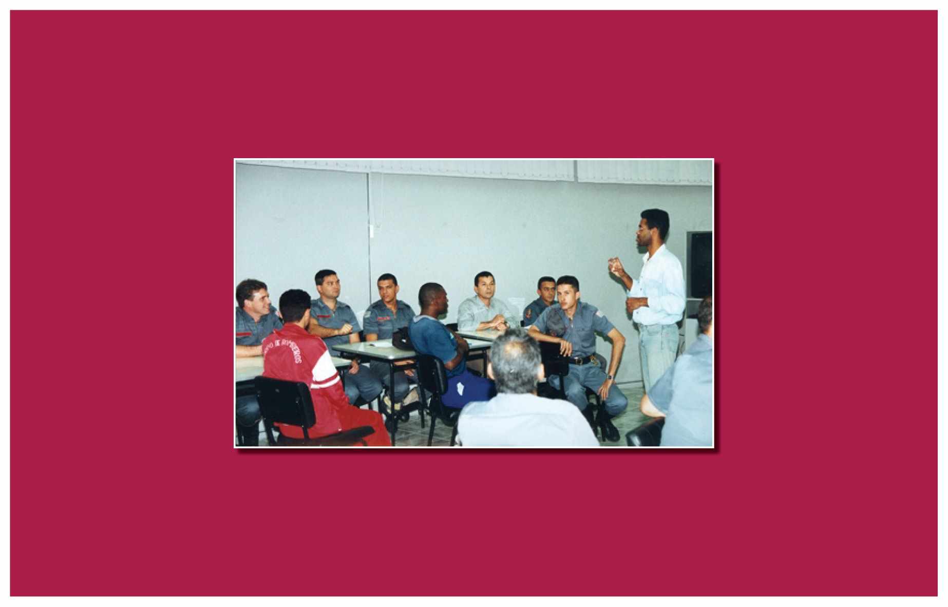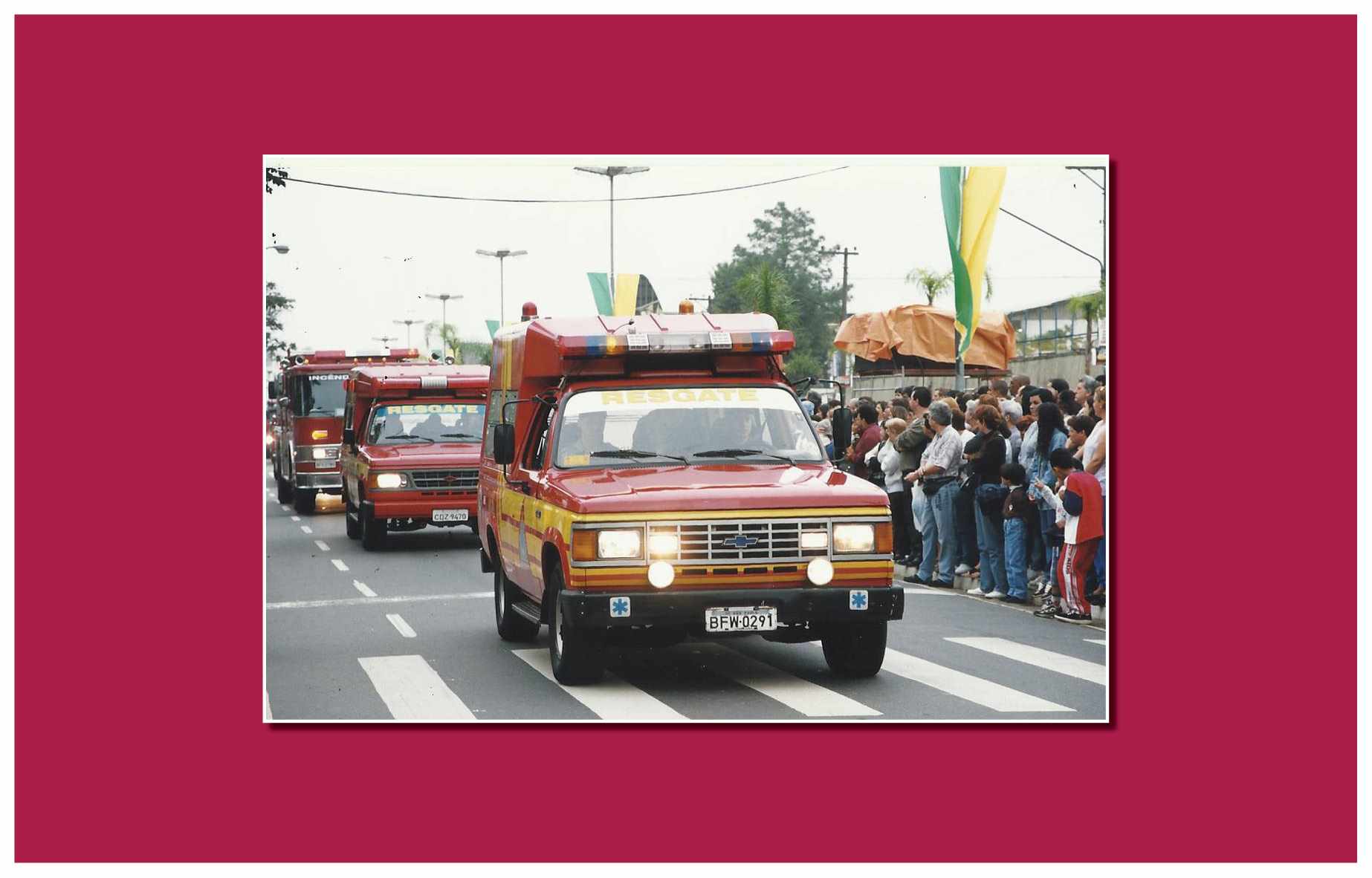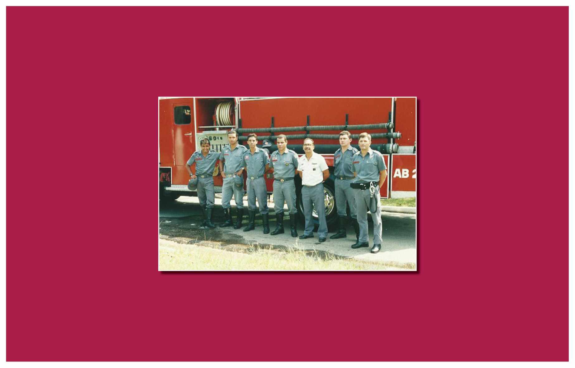 Homenagem, realizada pela Câmara Municipal em 1998, entregue aos bombeiros que se destacaram pelos bons serviços prestados ao município de São Caetano do Sul. Agachados, da esquerda para a direita, vemos: Brilhante, Wlamir, Rubens, Haiz e Bento. Em pé, estão: Ponsio, José Luiz, Paulino, Marsic, Oscar e Cadengue